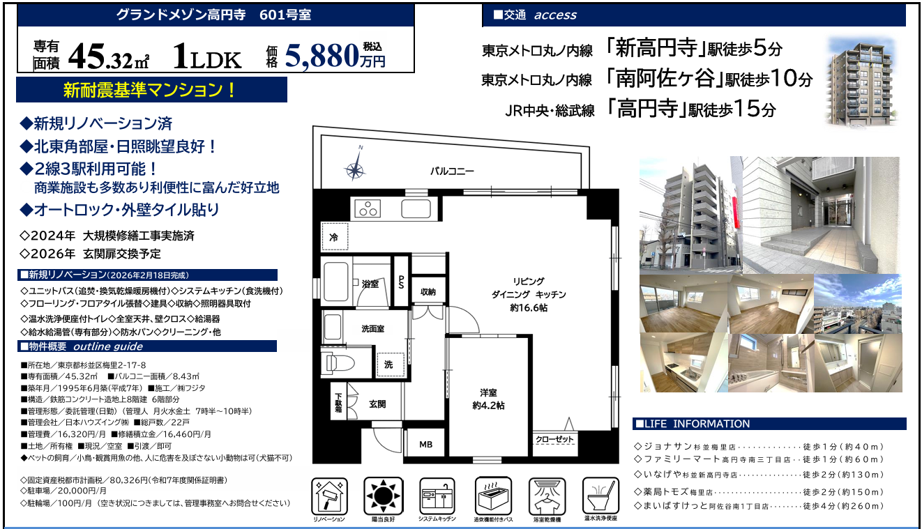 新物件のご紹介をさせていただきます 「グランドメゾン高円寺」新規リノベーション済